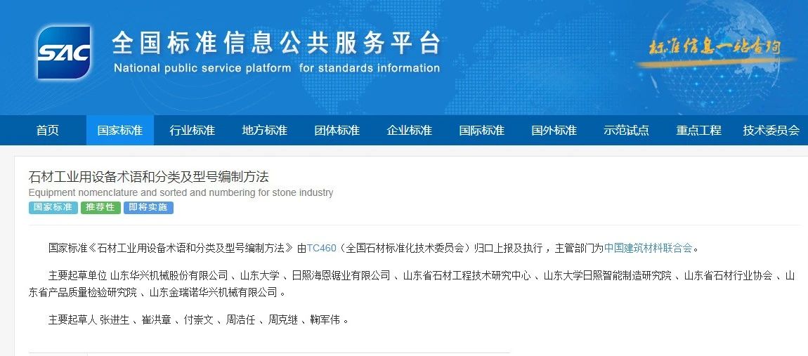 近日国家市场监管总局(国家标准化管理委员会)发布2021年第3号中国国家标准公告,批准yl23455永利官网张进生教授主持制订的GB/T39811-2021《石材工业用设备术语和分类及型号编制方法》国家标准正式发布。
