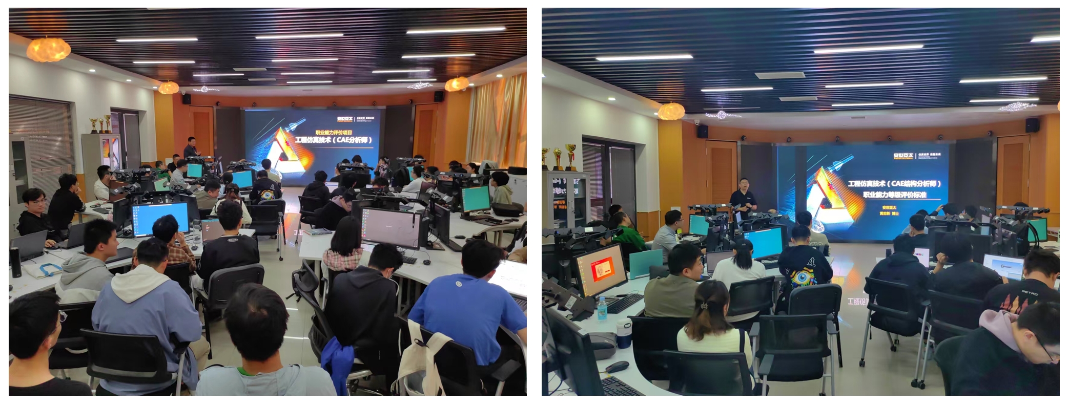 培训会上,赵亚辉首先对工程仿真技术(CAE分析师)的认证进行了介绍,分别从项目背景与目标、鉴定认证机构、认证考试要求、考试内容、考试形式等方面做了讲解。黄志新对仿真能力体系模型、职业能力等级评价标准进行了介绍,并展示了CAE结构分析师与CAE流体分析师的理论知识与操作技能试题。随后进行了上机培训,实验中心教师与学院师生在机房进行了实操,强化培训内容,针对工程仿真技术在教学中的应用展开了热烈研讨。