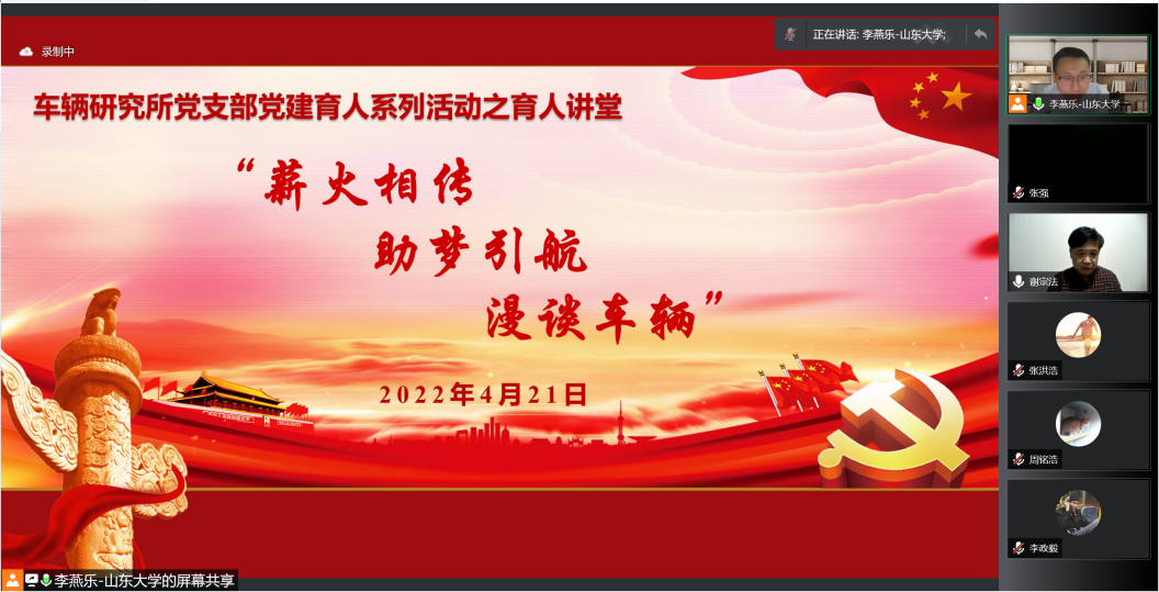 4月21日晚,机械工程学院车辆工程研究所党支部联合本科第一第二党支部举办“薪火相传,助梦引航,漫谈车辆”育人讲堂。学院党委副书记刘玥、车辆工程研究所全体教师参加了活动,研究所党支部书记李燕乐教授主持了活动。