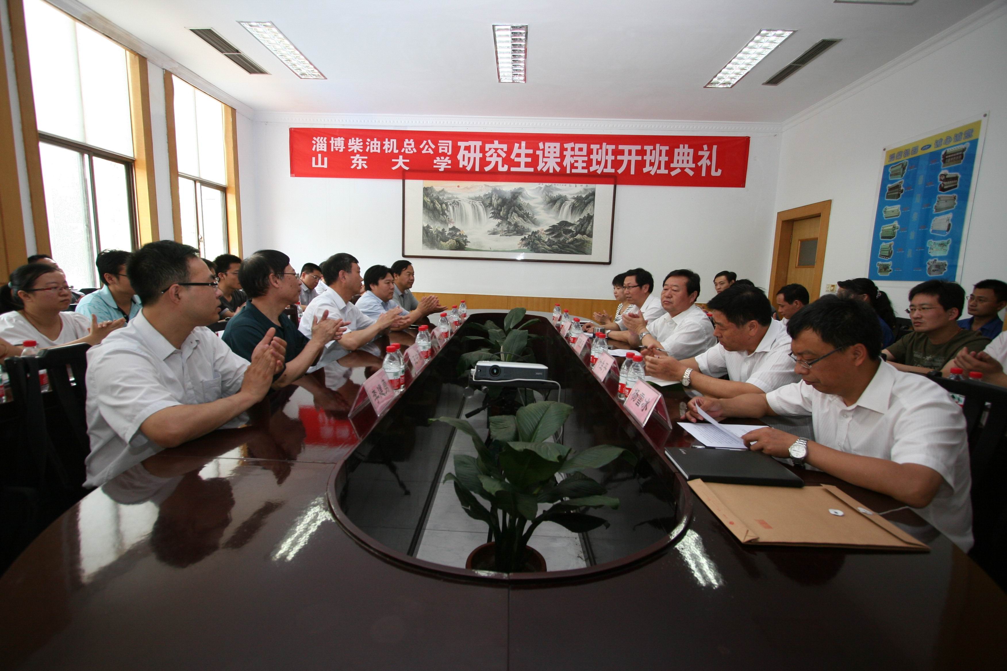 6月9日上午,由山东大学和淄博柴油机总公司联合办的研究生课程班开班典礼在淄博市淄博柴油机总公司办公楼会议室举行。yl23455永利官网院长、博士生导师李剑峰教授,机械工程学院党委副书记仇道滨和淄博柴油机总公司董事长邓德乐,公司纪委书记工会主席叶生平,总工程师黄猛,总裁办主任张翠,总经理助理人力资源部部长杨雪冰以及30位学员参加了开班典礼。