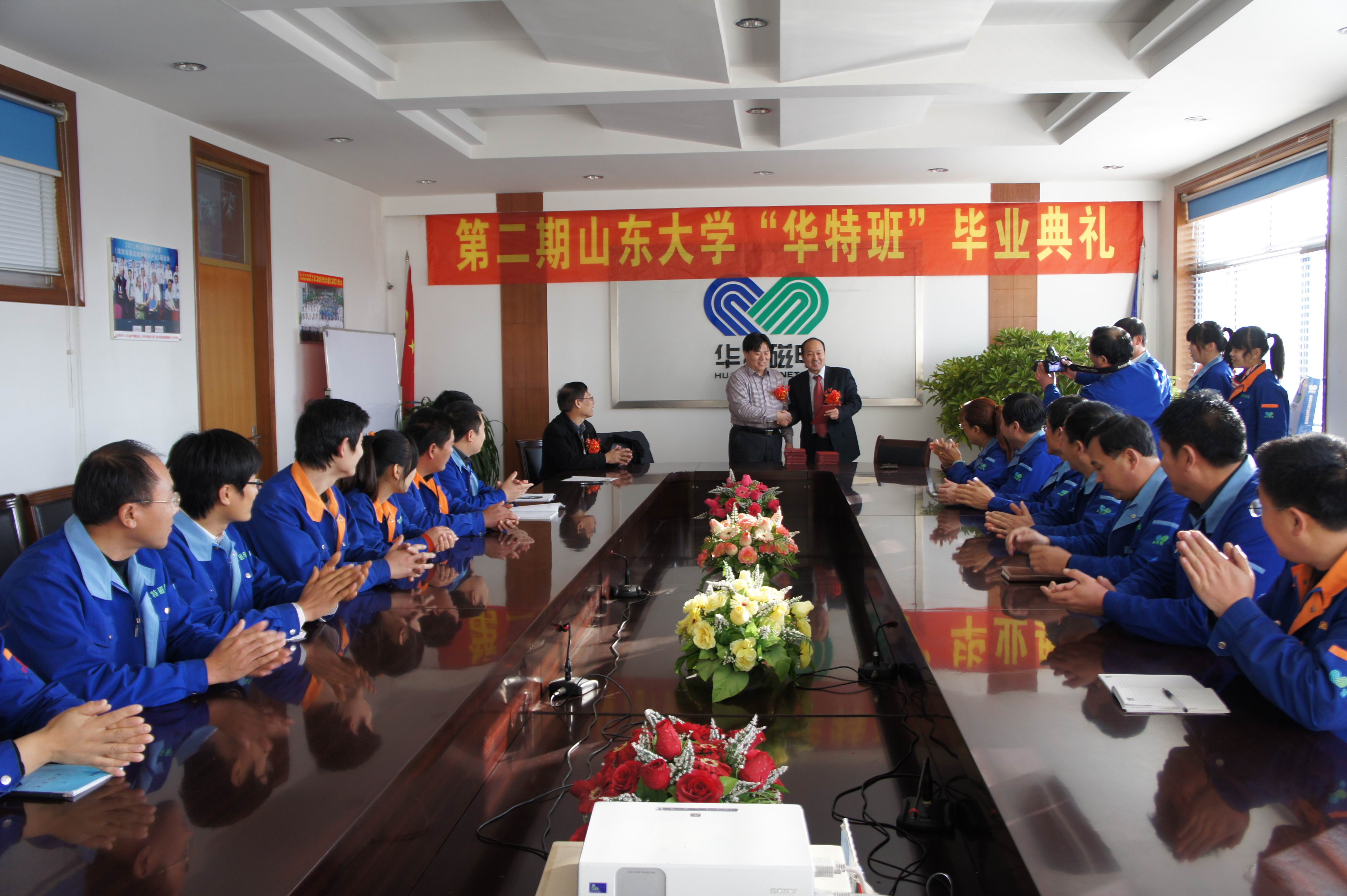 2012年12月1日上午,由yl23455永利官网和山东华特磁电科技股份有限公司联合举办的第二期网络高等教育本专科班毕业典礼在华特磁电科技股份有限公司办公楼会议室隆重举行。yl23455永利官网党委副书记仇道滨,山东华特磁电科技股份有限公司董事长兼总经理王兆连,公司人力资源部部长王建功、办公室主任秦学军以及毕业学员和正在第三期班学习的部分学员参加了典礼。
