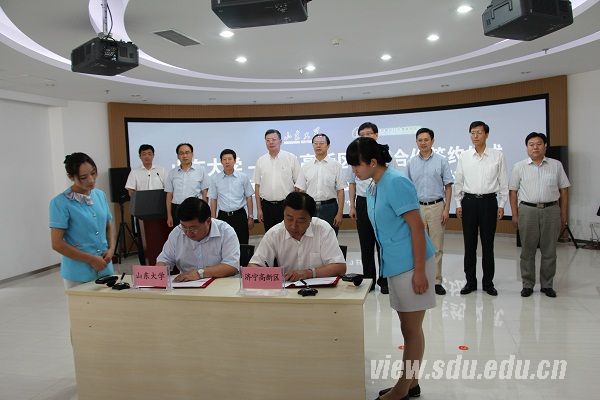 山东大学合作发展部部长王飞与济宁高新区管委会主任董信江代表双方签约。根据协议,双方将建立“山大—济宁高新区校企合作平台”,共建四个基地,开展产学研全面合作。一是共建“山大-济宁高新区高端装备制造技术研究基地”。 每年举办一届“装备制造业发展高端论坛”,开展学术交流活动;联合开展装备制造业及相关领域的新技术、新产品、新工艺等方面的技术研究与开发;形成产学研联合体,共同申报国家、省部各类科技项目,共建工程技术研究中心、博士后科研工作站和院士工作站;开展装备制造业及相关领域发展的前瞻性研究。二是共建“山大-济宁高新区装备制造业工程教育培养基地”。开展企业在职职工联合培养,培养一定数量的“先进制造”领域在职工程博士、“机械工程”或“车辆工程”或“工业工程”领域工程硕士、成人高等教育或网络教育本科和专科生;双方根据企业需要开展非学历专业技术培训。三是共建“山大-济宁高新区应用型人才培养基地”。山东大学每年选派100-200名学生入驻济宁大学园,进行产学研合作和联合教学实践活动,接受大学园统一管理,共建应用型人才培养基地,为高新区提供需要的人才资源。四是共建“山东大学学生社会实践基地”。高新区每年接收山东大学相关专业不少于30名研究生、本科生到企业进行社会实践活动和生产实习。