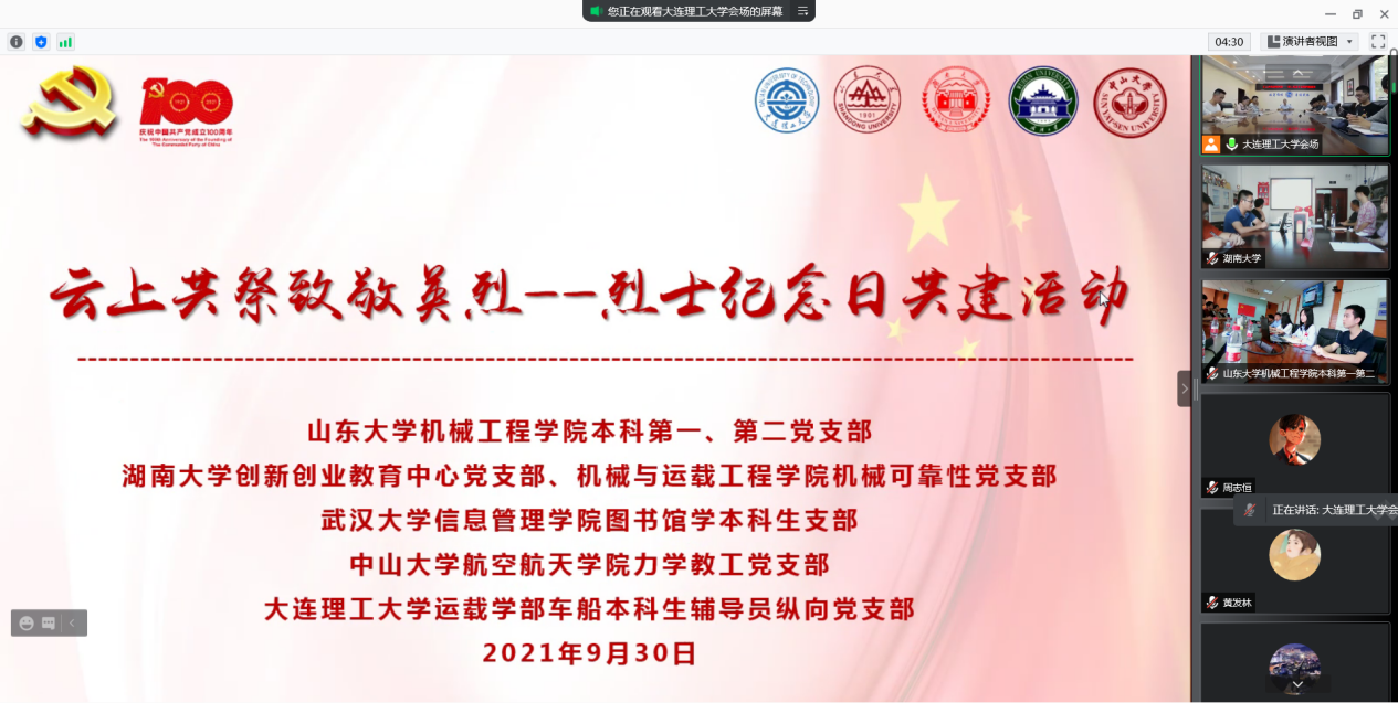 2021年9月30日是我国第八个烈士纪念日,为深切缅怀革命先烈、致敬人民英雄,铭记革命历史、坚定理想信念,yl23455永利官网本科生第一、第二党支部携手大连理工大学、湖南大学、武汉大学、中山大学等共5所“双一流”高校师生党支部开展“云上共祭致敬英烈”共建活动,以视频直播连线的方式走访各地爱国主义教育基地,交流研讨“我为群众办实事”工作经验,创新党史学习教育形式,深入挖掘红色教育资源。yl23455永利官网本科第一、第二党支部、大连理工大学运载学部车船本科生辅导员纵向党支部、湖南大学创新创业教育中心党支部、机械与运载工程学院机械可靠性党支部、武汉大学信息管理学院图书馆学本科生支部、中山大学航空航天学院力学教工党支部的党员参与了此次活动。