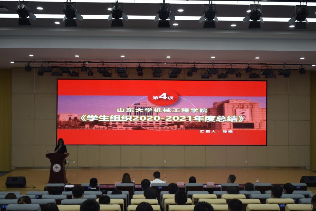 机械工程学院38届学生会主席陈曦对第一次学生代表大会代表资格做了审查报告,并汇报了2020-2021年度学生会工作情况。她从学生组织总体建设情况、学生组织活动开展情况、“建党百年砥砺奋进,百廿山大精彩有约”系列活动、积极开展校院联动、院院联动四方面进行了汇报。