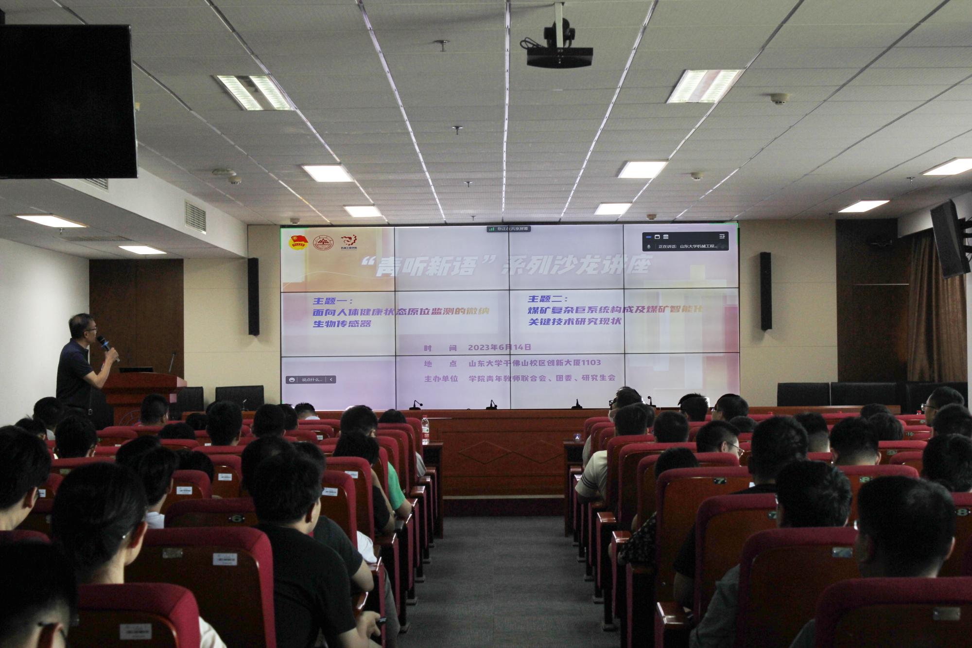 沙龙活动结束后,第一期青听新语系列沙龙讲座在1103进行。王子然研究员和赵国瑞教授分别做了题为《面向人体健康状态原位监测的微纳生物传感器》及《煤矿复杂巨系统构成及煤矿智能化关键技术研究现状》的讲座。闫鹏老师作为讲座主持人,部分青年教师与研究生参与此次讲座。王子然提到,围绕国家“健康中国2030”战略和山东省“医养健康”规划,微纳生物传感器研究意义重大。讲解了微纳传感器在面向大健康领域应用的医工装备,以及在个性化医疗器械和临床诊断等领域的应用前景和意义。赵国瑞讲解了煤矿智能化开采以及中国能源发展趋势,指出现阶段我国能源需求量大,矿业开采中仍存在诸多问题需要解决,进而引出了现在的煤矿智能化开采关键技术的研究。讲座的最后,王子然与赵国瑞对同学们的提问进行了详细解答。