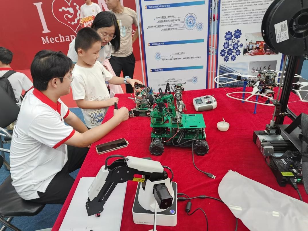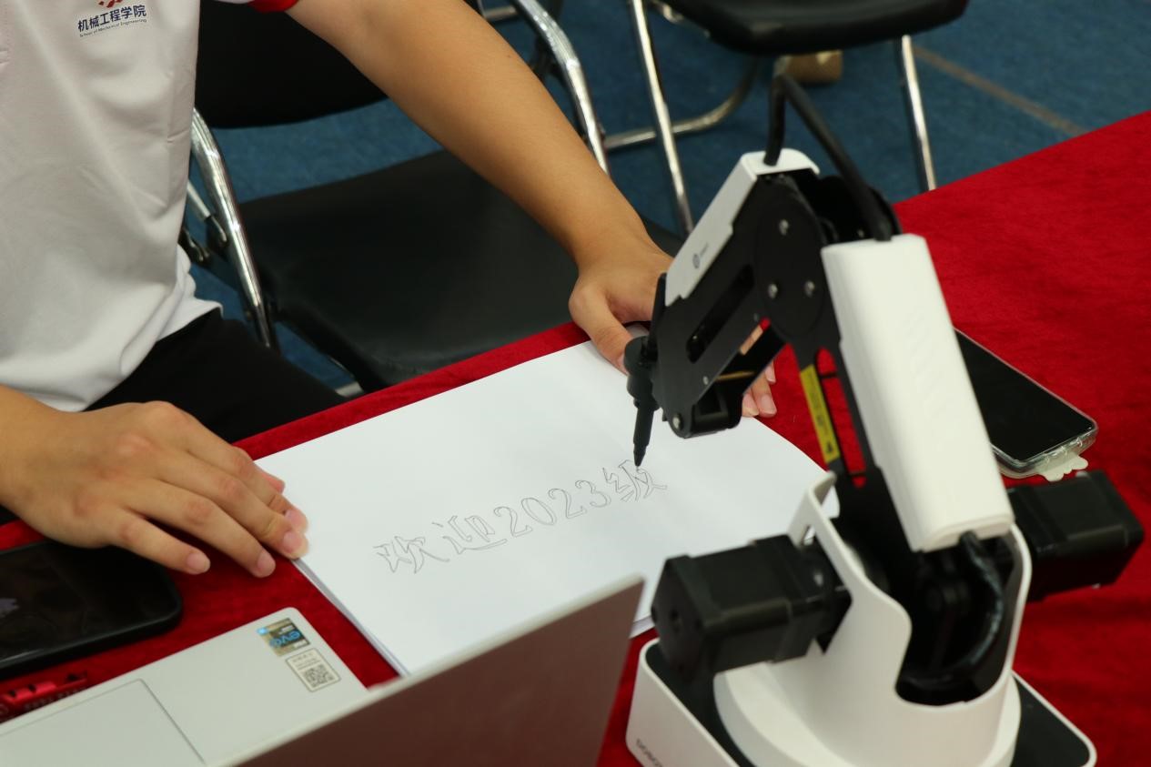 大国重器,艾兴精神薪火传。为激发青年学子科创兴趣,在建设科技强国中谱写青春之歌,机械工程学院精心布置了科技展区,由志愿者讲解演示历届优秀科创作品。“六足机器人”通过机器视觉画面回传,可自主完成颜色识别、目标追踪、自动避障、语音识别等功能; “变胞机器人”配备摄像头、触觉传感器、光电传感器、语音模块,具有多变的形态和灵活的运动;“魔术师机械臂”通过python编程,可在纸上写下迎新话语,与同学们互动。同时,新生们可在观影席上观看学院宣传片,了解机械工程学院的前世今生,机械专业在建设科技强国中的重要地位和艾兴院士的传奇故事,进一步增加新生对机械学科的兴趣。