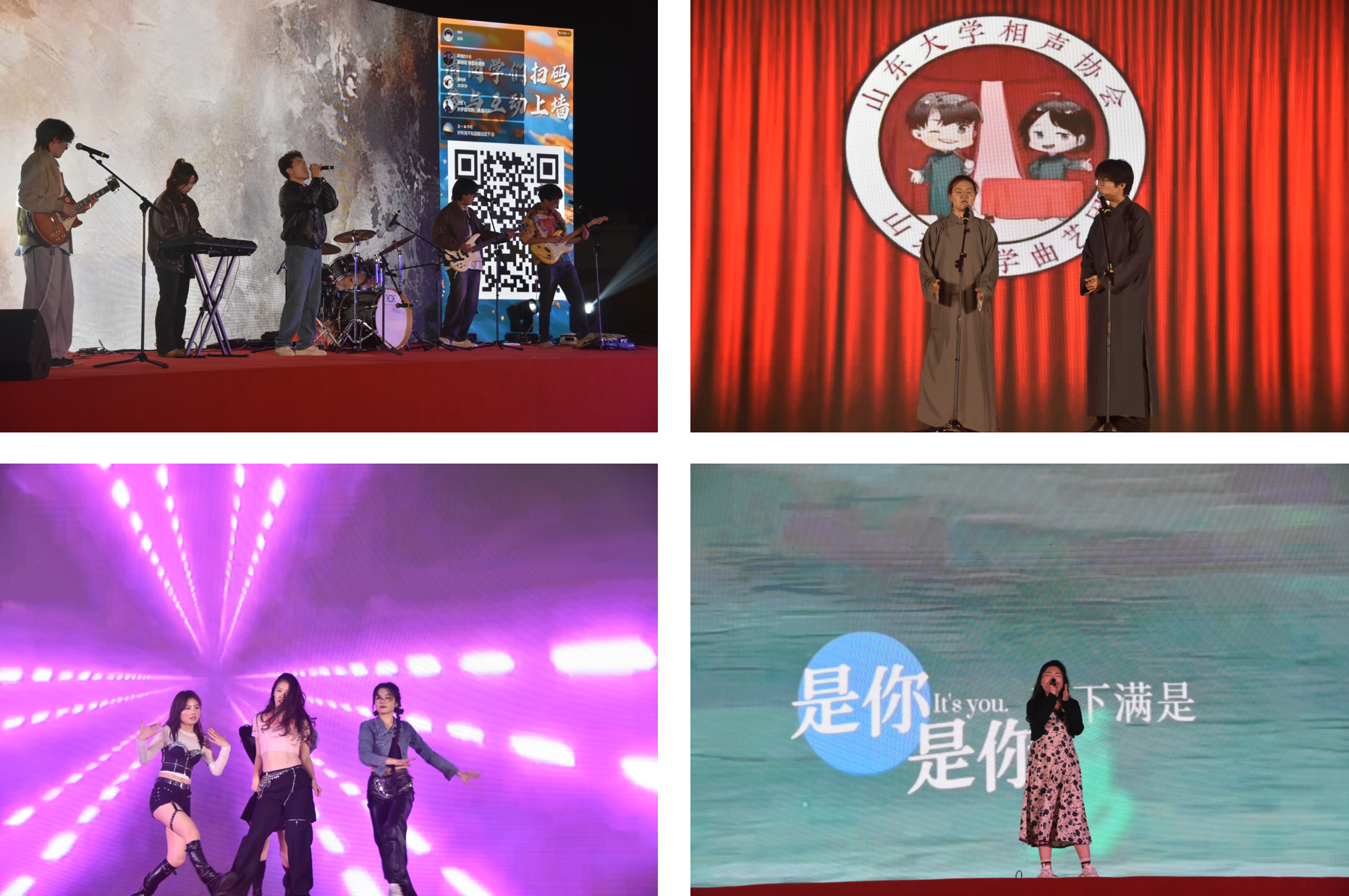 在晚会最后的篇章“苒苒风华,奋楫远航”中,“水曜日定休”乐队激情演唱了《鲜花》和《橘子花火》,将青春的气息与活力传递给每一个观众;相声协会则带来了生动有趣的《怯之旅》,让笑声回荡在整个会场,增添了欢快的气氛;街舞表演《Lovesick Girls》如火如荼,将晚会的气氛推向了高潮,舞者们的热情感染了所有人;最终,晚会在山东大学十佳歌手尹静涵深情演唱的《是你》中圆满落幕,留给观众无限的回味与感动。