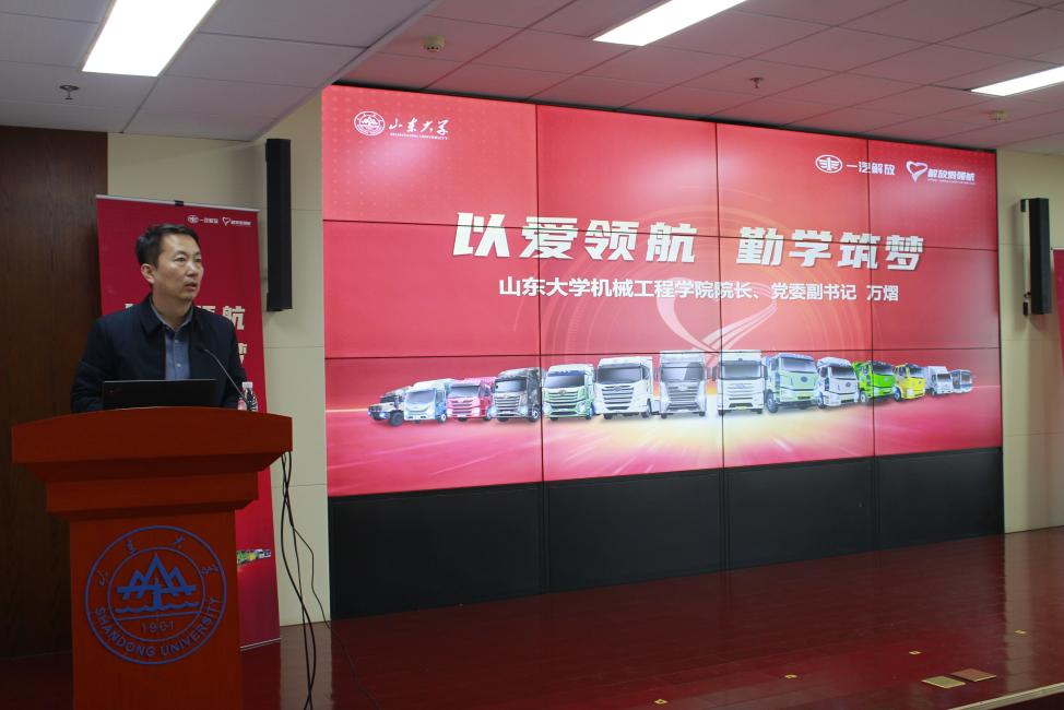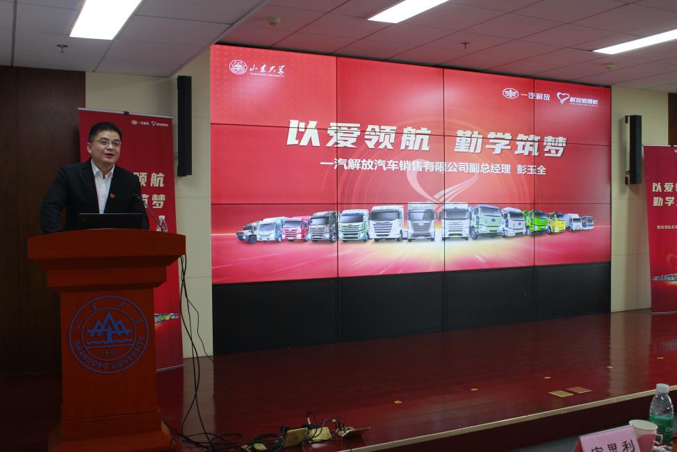 一汽解放汽车销售有限公司副总经理彭玉全介绍企业发展现状与未来规划,强调了人才对于汽车行业创新发展的关键作用。他表示,山东大学深厚的学术底蕴和优秀的人才储备,与一汽解放的发展理念高度契合。通过设立奖学金,企业希望加强校企联系,吸引更多优秀山大学子投身汽车产业,为行业发展注入新鲜血液。